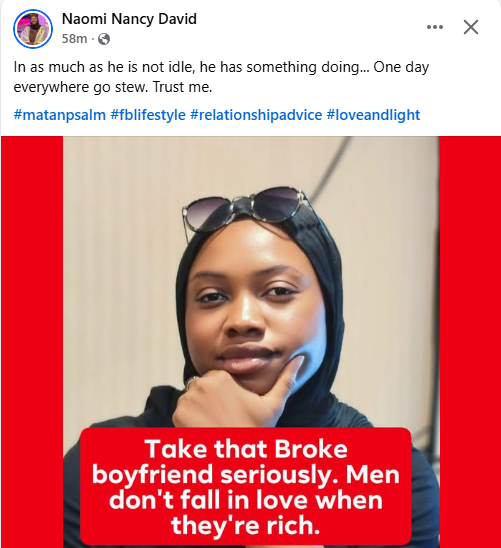 “Take that broke boyfriend seriously. Men don’t fall in love when they are rich,” she wrote in a Facebook post on Thursday.