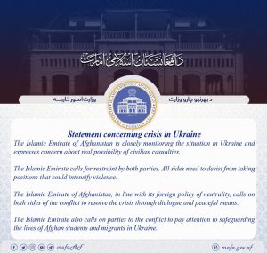 The statement reads: “The Islamic Emirate of Afghanistan is closely monitoring the situation in Ukraine and expresses concern about the real possibility of civilian casualties.