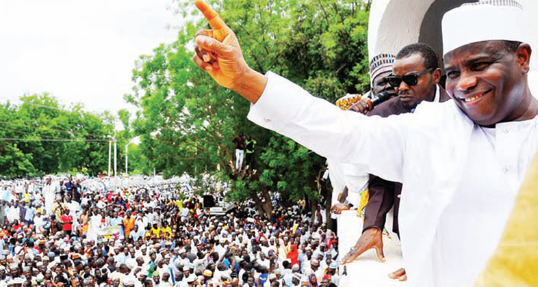 Sokoto State Governor, Mr Aminu Tambuwal (right) acknowledging cheers from his supporters during his defection from the All Progressives Congress to the Peoples Democratic Party in Sokoto… on Wednesday. Photo: NAN