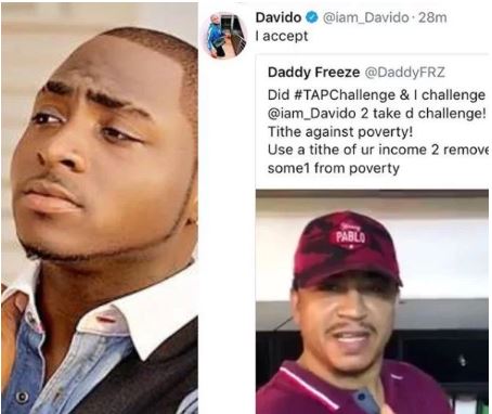 Yesterday, Freeze challenged Nigeria singer and DWM Boss Davido to do so and he accepted wholeheartedly. Freeze is surely gaining more momentum with his Tithe campaign.