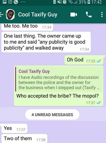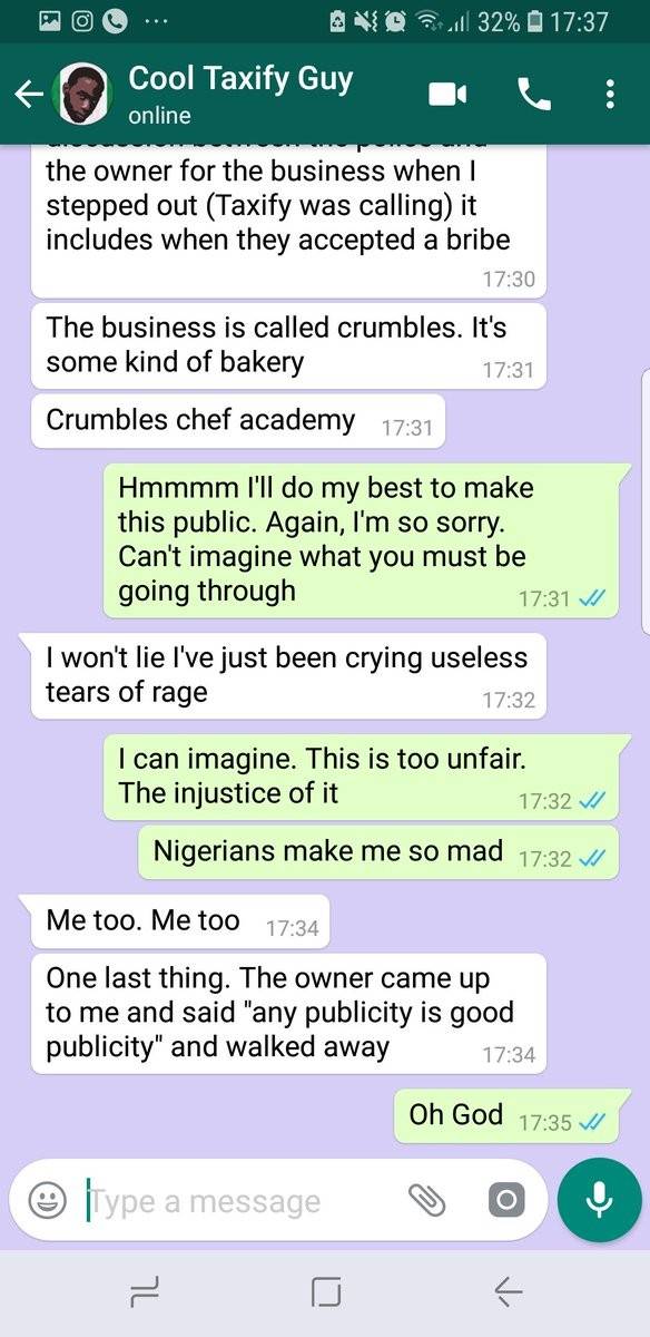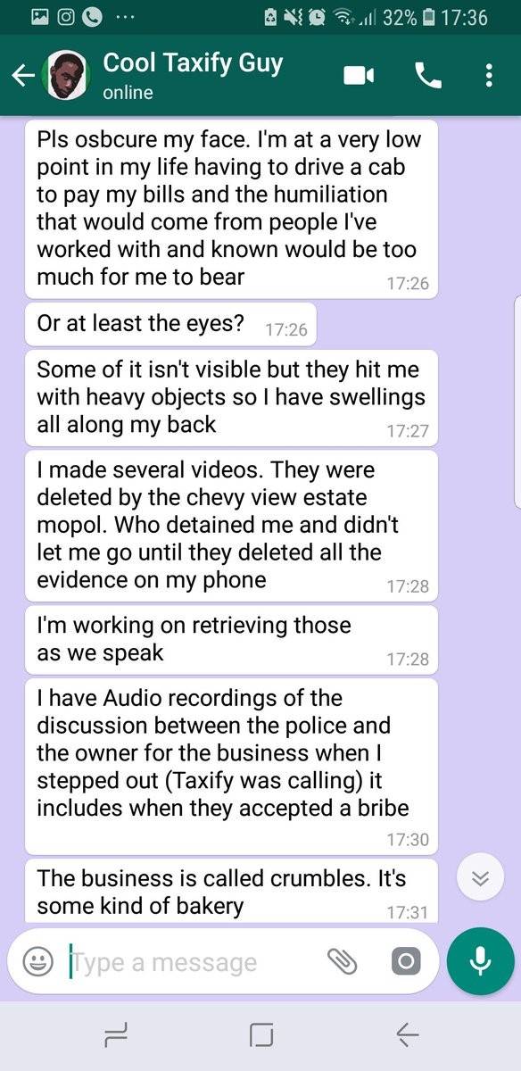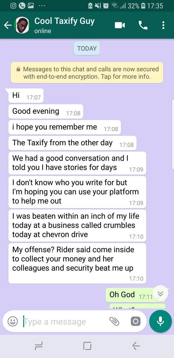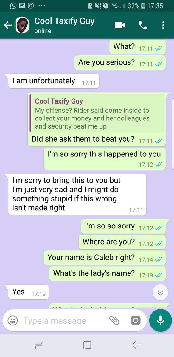She wrote: “I met this taxify guy on Monday this week. Amazing guy with very good energy. We had great conversations. He messaged me today to tell me about how a rider ordered her estate security to beat him up. This chat made me so sad”