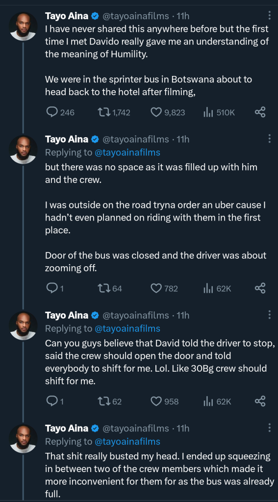 In a post on his X page, he revealed that he had gone to Botswana for a shooting, after which Davido and his crew had entered the bus.
