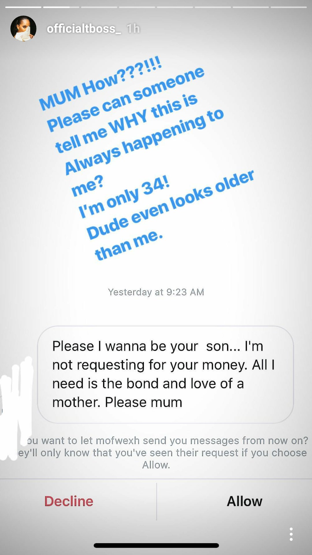 Ex big brother Naija housemate,Tokunbo Idowu popularly known as TBoss has gotten a request by a man who looks older than her, to be his mother. Lol!