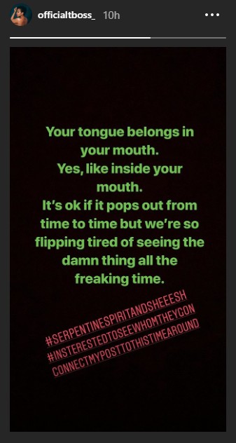 TBoss who took a swipe at an unknown critic, told the person her shade was meant for to learn to keep his/her tongue in his/her mouth which is where it belongs. TBoss who told her critic to keep his/her tongue in her mouth, added that they are tired of seeing same drama the whole time.