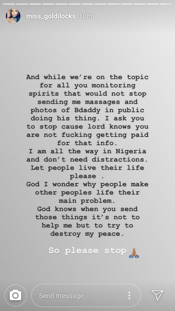 TBoss’ sister also warned people to stop sending her photos of Dameon who seems to have moved on, with another lady.