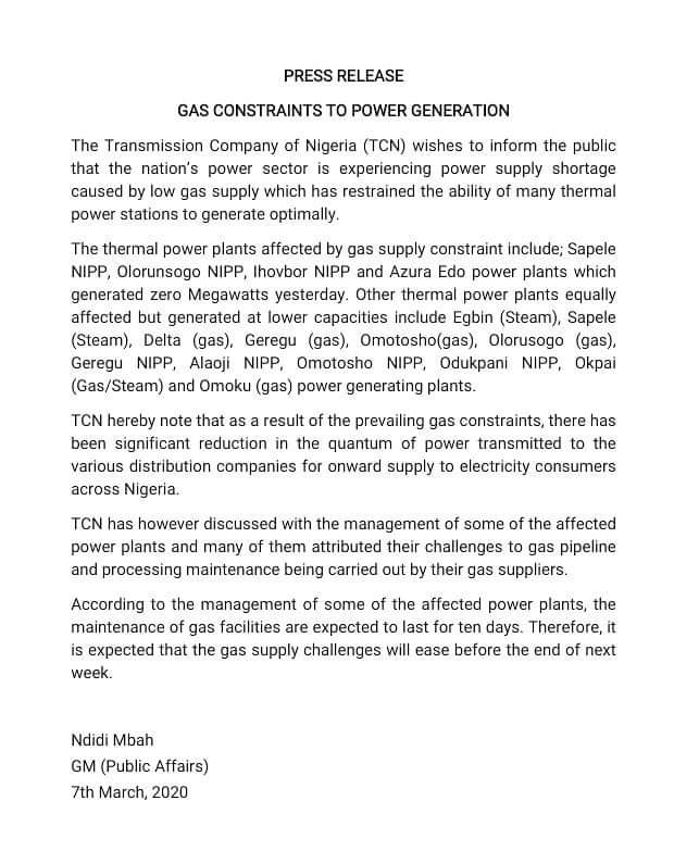 The Transmission Company of Nigeria (TCN) on Saturday, said it was caused by low gas supply.