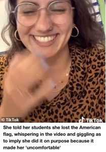 The TikTok video posted by the teacher has since gone viral, sparking a backlash from many parents who were angry she was teaching children to ‘disrespect’ the American flag.