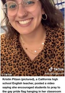 Kristin Pitzen, of Newport Mesa School District in Orange County, posted a video explaining the incident on TikTok, and has now been removed from the classroom as the school investigates.