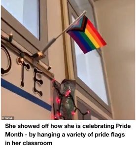 In the video, she admitted she’d removed the American flag because it made her ‘uncomfortable’, and told her class to say the Pledge of Allegiance to the gay pride flag.