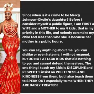 “Since when is it a crime to be Mercy Johnson-Okojie’s daughter? Before I consider myself a public figure, I am FIRST a WIFE and a MOTHER to my 4 kids, that is my priority in this life, and nobody can make my child feel less than who she is because her mother is a public figure.