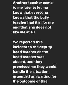 Another teacher came to me later to let me know that everyone knows that the bully teacher had it in for me and that she does not like me at all.