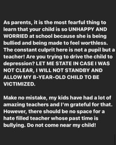 Make no mistake, my kids have had a lot of amazing teachers and I’m grateful for that. However, there should be no space for a hate filled teacher whose past time is bullying. Do not come near my child!”