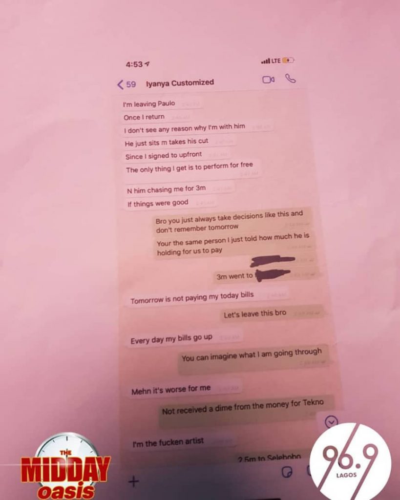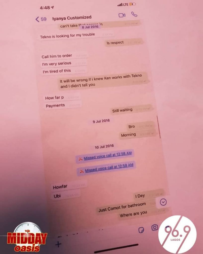 Tekno is looking for my trouble – These are the exact words Iyanya used while asking his former partner Ubi Franklin to warn the singer, according to a leaked chat by Ubi.