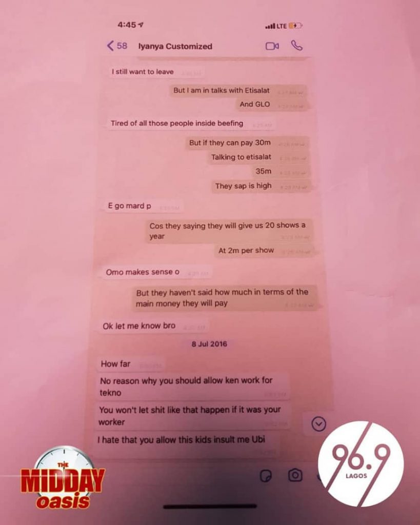 See some of the Whatsapp chats between Ubi and Iyanya below:
