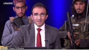 “Taliban militants are posing behind this visibly petrified TV host with guns and making him to say that people of #Afghanistan shouldn’t be scared of the Islamic Emirate.