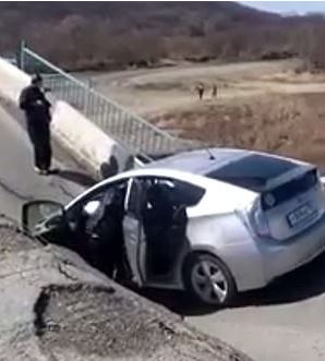 The aftermath of the incident is seen in a video from the incident which occured in Primorye, Russia. It shows the silver saloon car trapped at least five-feet below the surface of the crumbling bridge. Officials can be seen entering the hole to inspect the car as the camera operator pans around to show what happened.