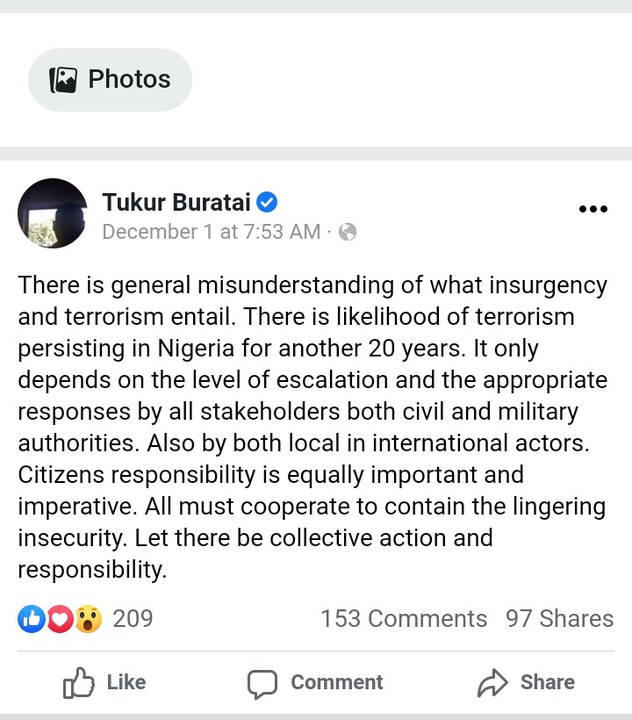The Chief of Army Staff, Lieutenant General Tukur Buratai, has hinted that insurgency and terrorism may continue in Nigeria for another 20 years.Buratai made the remark on his verified Facebook handle few days after Boko Haram massacred rice farmers in Borno State.