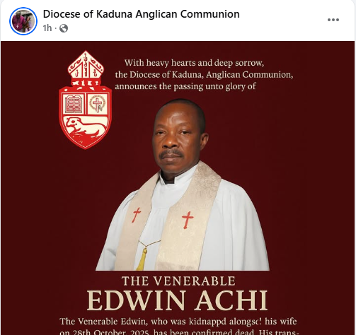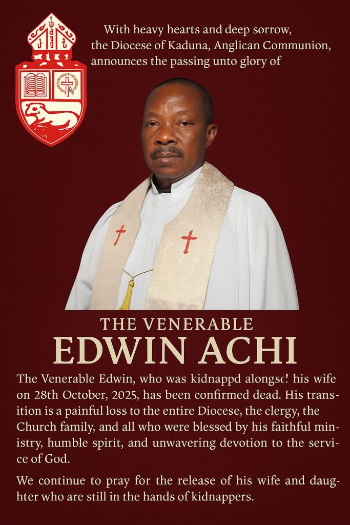 “Ven. Edwin Achi, who was kidnapped alongside his wife on 28th October, 2025, has been confirmed dead. His transition is a painful loss to the entire Diocese, the clergy, the Church family, and all who were blessed by his faithful ministry, humble spirit, and unwavering devotion to the service of God.