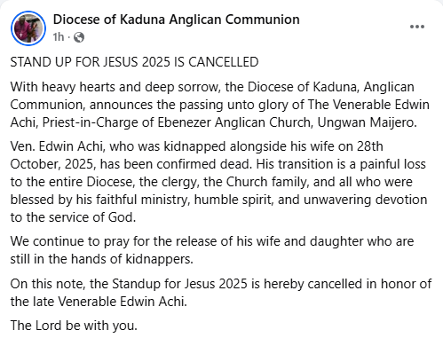 “We continue to pray for the release of his wife and daughter who are still in the hands of kidnappers. On this note, the Standup for Jesus 2025 is hereby cancelled in honor of the late Venerable Edwin Achi. The Lord be with you.”