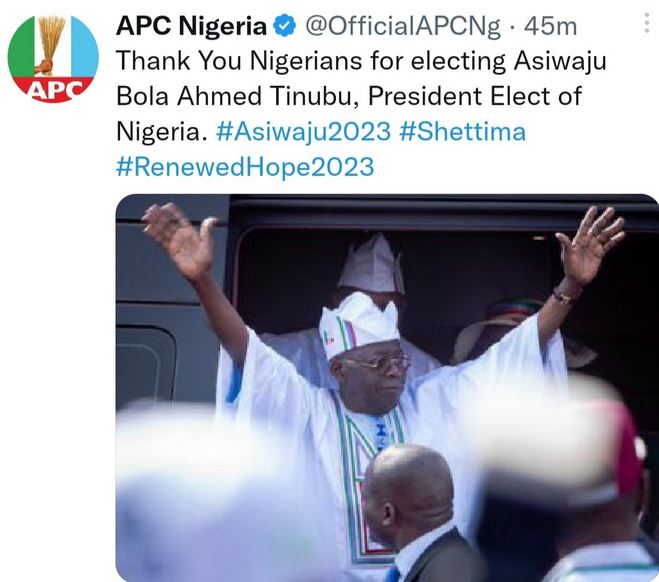 The All Progressives Congress APC has sent an appreciation message to Nigerians for electing its candidate, Asiwaju Bola Tinubu, as the President-elect.