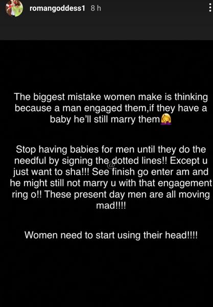Reacting, Instagram sensation, Roman Goddess warned Nigerian women to “stop having babies for men until they do the needful by signing the dotted lines.”
