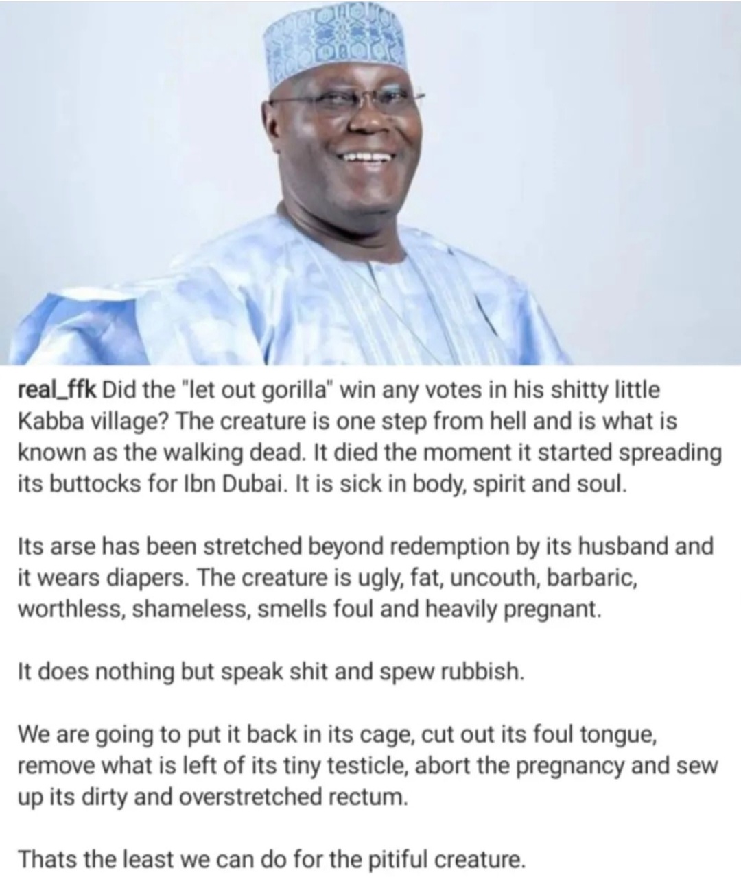 In a social media post, on Monday March 6, FFK called Atiku a “Gorrilla” and other unprintable names.