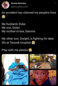 A woman identified as Dorcas Kemuma has taken to Facebook to mourn the death of her husband, son and mother-in-law on Christmas day.