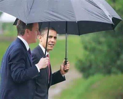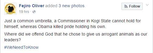 Facebook user Fejiro Oliver shared a photo of a Commissioner in Kogi State with a police aide holding an umbrella over his head compared to a photo of U.S president Barack Obama, and former UK prime Minister David Cameron holding their own umbrellas…