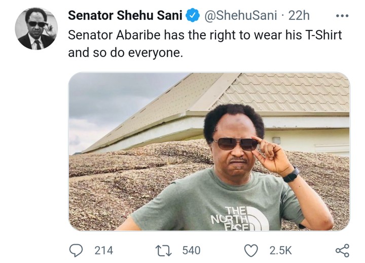 Reacting on Thursday via Twitter, Sani said Abaribe and everyone else has a right to wear the shirt.