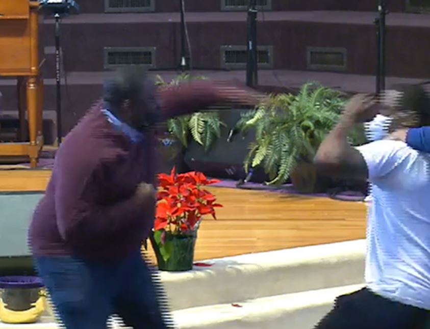 The preacher, Bishop Kevin Adams tried in vain to stop the fight, saying, “Stop it, Marcus. Marcus, come on.”
