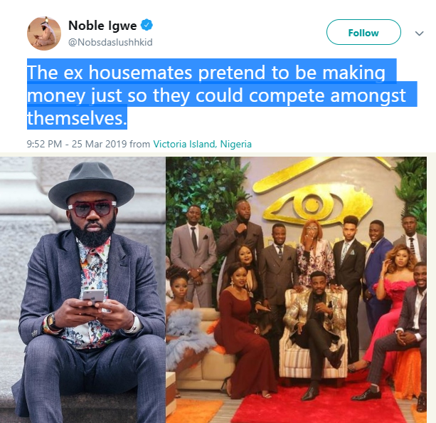 Noble Igwe in his tweet after the disclosure, said they housemates pretend to be making money to compete amongst themselves. He wrote ‘the ex housemates pretend to be making money just so they could compete amongst themselves’.