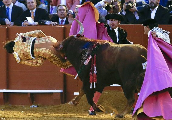The eye-watering moment a matador is gored in the buttocks by a raging bull