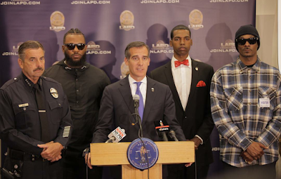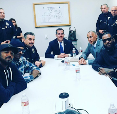 The two rappers arrived at the LAPD headquarters where they had a private meeting with L.A. Mayor Eric Garcetti, Police Chief Charlie Beck and other top police official while the graduation ceremony of new LAPD recruits was going on.