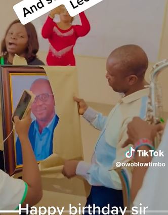 Some of the students who were outside the class moved in with a saxophonist in front as they sang birthday songs for their lecturer.