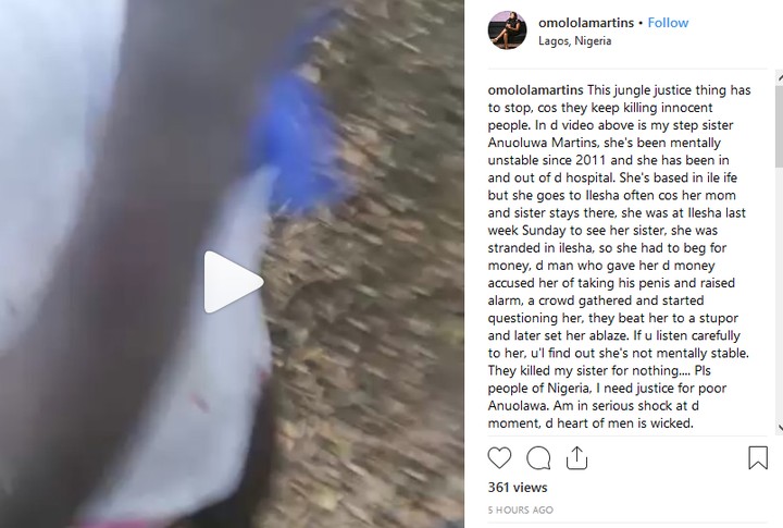 She’s based in ile ife but she goes to Ilesha often cos her mom and sister stays there, she was at Ilesha last week Sunday to see her sister, she was stranded in ilesha, so she had to beg for money, d man who gave her d money accused her of taking his joystick and raised alarm, a crowd gathered and started questioning her, they beat her to a stupor and later set her ablaze.