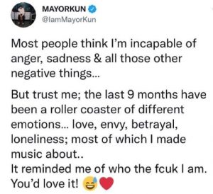 Mayorkun however averred that the last 9 months has been a rollercoaster of different emotions which includes love, envy, betrayal and loneliness.