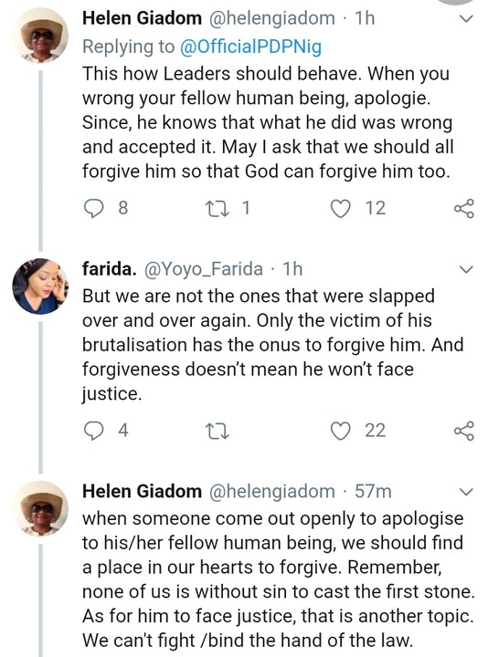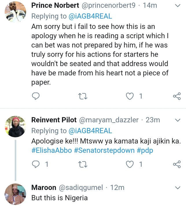 “My family and religious upbringing do not give approval to such conduct and for this, as a leader, I seek forgiveness before God and all those who feel offended by my action. “Indeed, this episode has taught me a very great lesson both as a private citizen and a public officer, particularly as a senator of the Federal Republic of Nigeria upon whom public confidence is bestowed.”