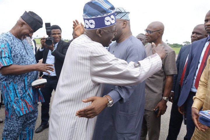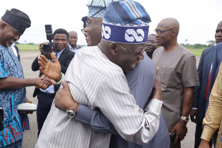 Putting asides their political differences, APC National leader, Bola Tinubu and Atiku Abubakar, were all smiles as they hugged each other at Akure airport in Ondo state this morning. In politics, no permanent enemies or friends.
