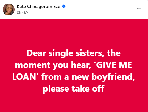 “Dear single sisters, the moment you hear, ‘GIVE ME LOAN’ from a new boyfriend, please take off,” she wrote on Friday.