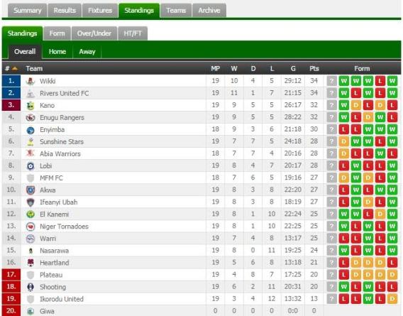 Wikki Tourists top the Nigerian football league table followed by Rivers United, Kano Pillars and Rangers FC of Enugu. Ikorodu United of Lagos are still bottom of the table.