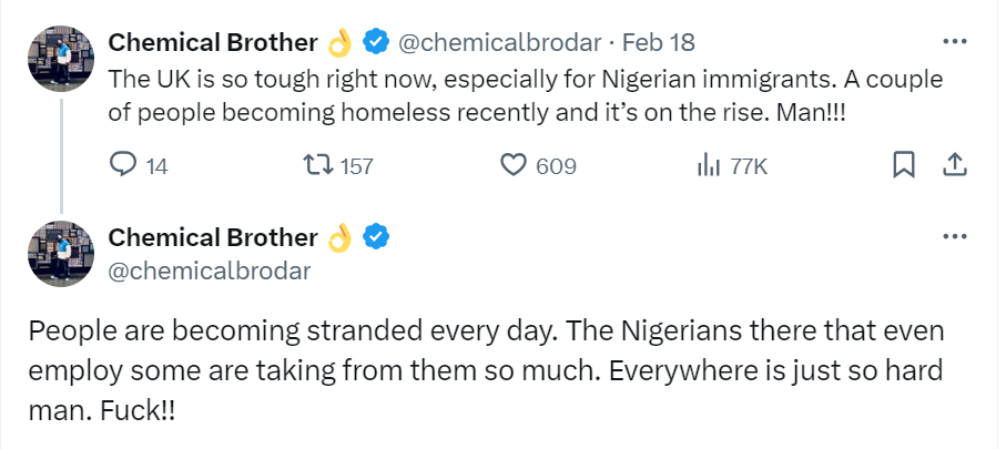 “The UK is so tough right now, especially for Nigerian immigrants. A couple of people becoming homeless recently and it’s on the rise. Man!!! People are becoming stranded every day. The Nigerians there that even employ some are taking from them so much. Everywhere is just so hard man. Fuck!!”