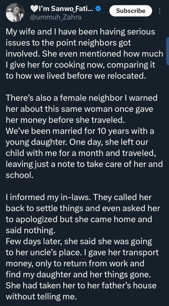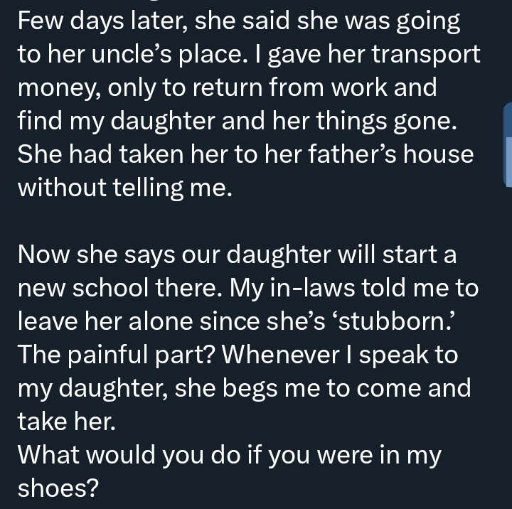 A Nigerian man has shared his emotional story online after his wife allegedly moved away with their daughter without his consent, following prolonged marital issues.