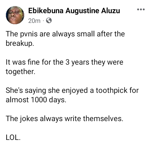 “The pvnis are always small after the breakup. It was fine for the 3 years they were together. She’s saying she enjoyed a toothpick for almost 1000 days. The jokes always write themselves,” he wrote on Thursday.