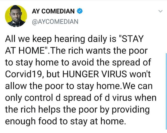”The Rich Are Afraid Of Covid-19 And Want The Poor To Stay At Home, The Poor Are Afraid Of Hunger” – Comedian, AY