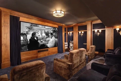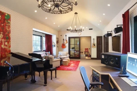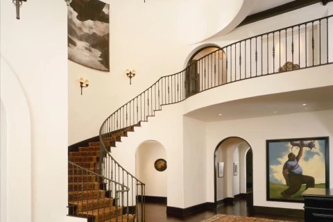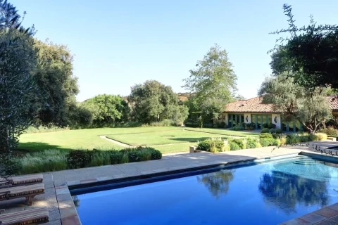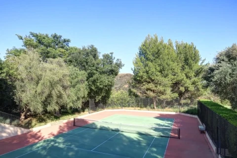 The home features a top of the line gym, full-size tennis court, a baseball diamond, a movie theater, a music studio, indoor and outdoor swimming pools, an elevator, and dozens of olive trees spread around the property, as well as an olive-tree lined driveway.