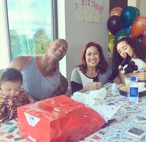 The Rock pictured with his 2 daughters & his mum on his birthday
