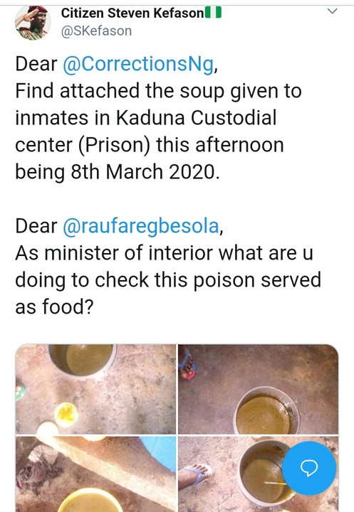 Find attached the soup given to inmates in Kaduna Custodial center (Prison) this afternoon being 8th March 2020.