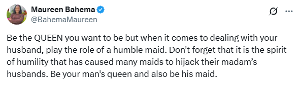 “Be the QUEEN you want to be but when it comes to dealing with your husband, play the role of a humble maid. Don’t forget that it is the spirit of humility that has caused many maids to hijack their madam’s husbands. Be your man’s queen and also be his maid,” she wrote.