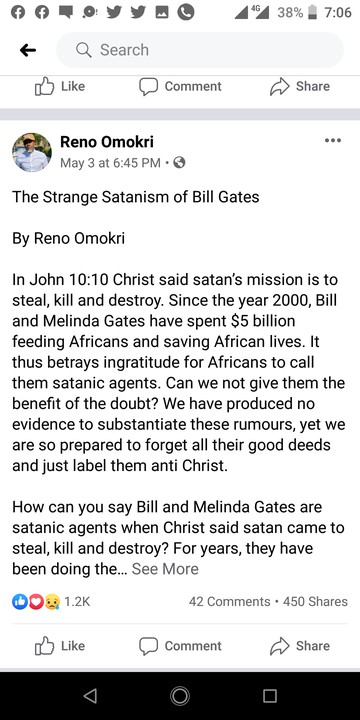 Their only contribution to the #CoronaVirus fight is to insult Bill and Melinda Gates, who have spent more money on African’s health than their own governments Bill and Melinda Gates were not satanic agents when they provided anti malarial medicines to Nigeria, or when they provided food aid to the insurgency ravaged Northeast. Now they are satanic. Africa and ingratitude.