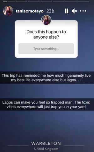 Omotayo in an Instastory post she shared, said the toxic vibes in Lagos will make you feel so trapped.